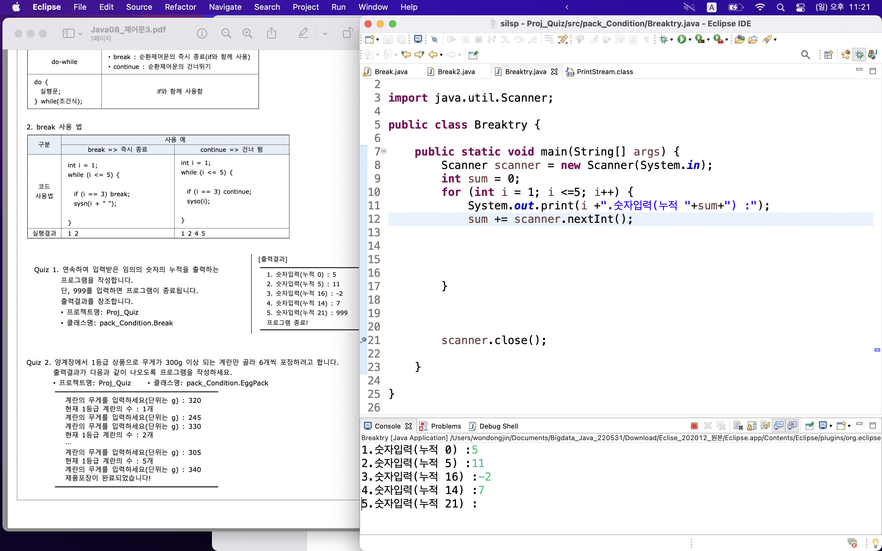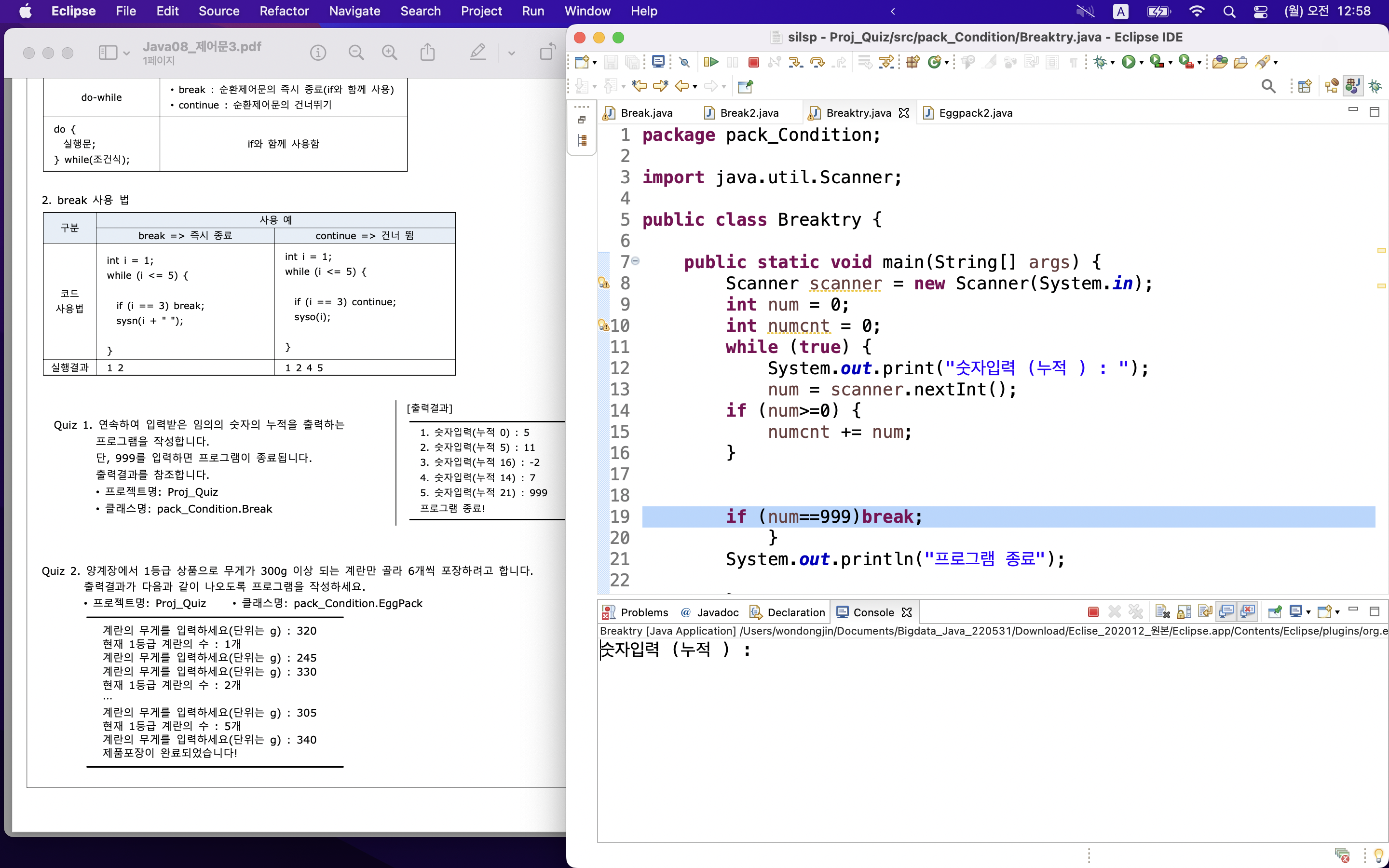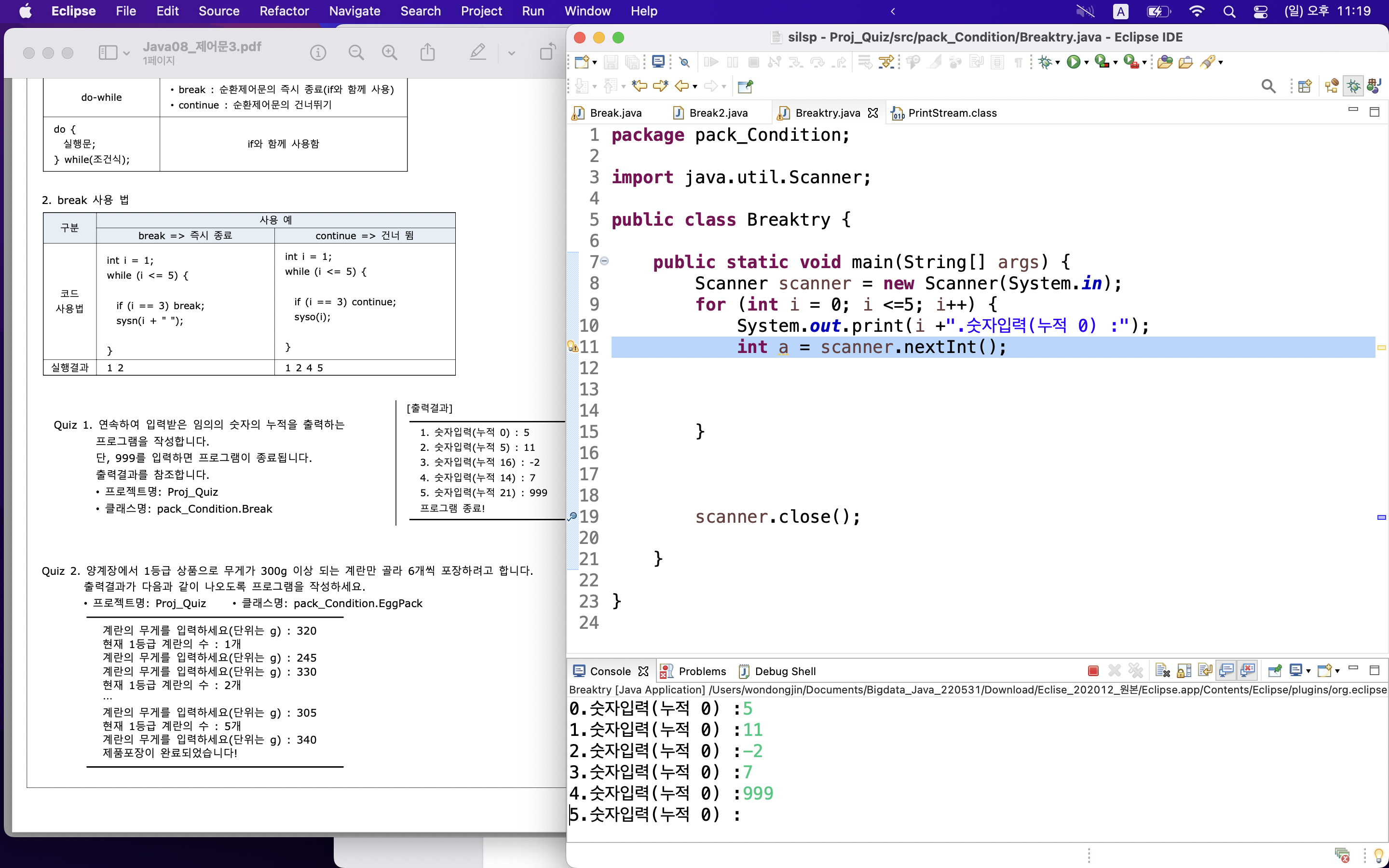 술술 풀리는 가 싶더니 계속 break;에서 막힌다. 분명히 나는 저 위에 break; 사용법 보고 따라했는데