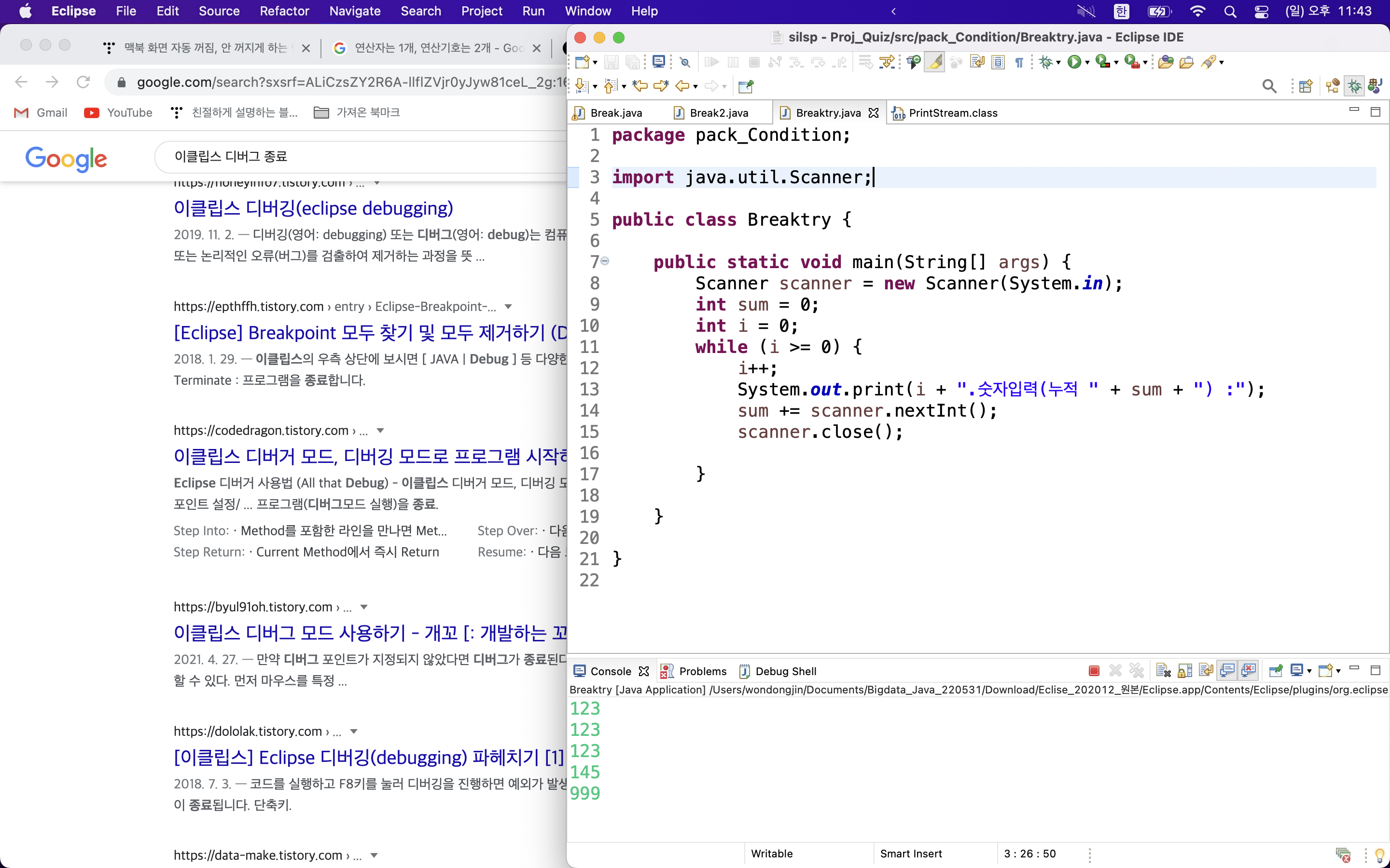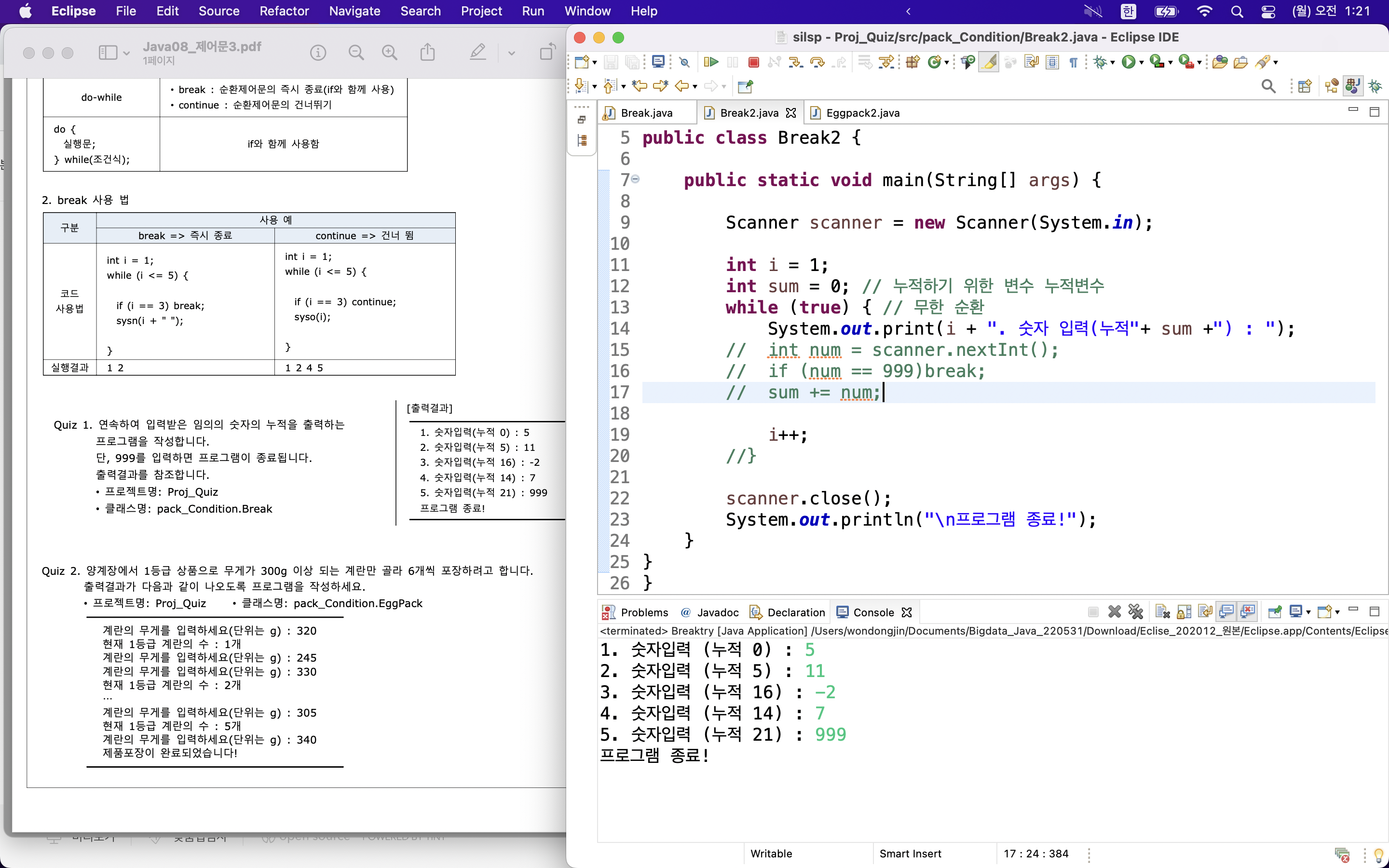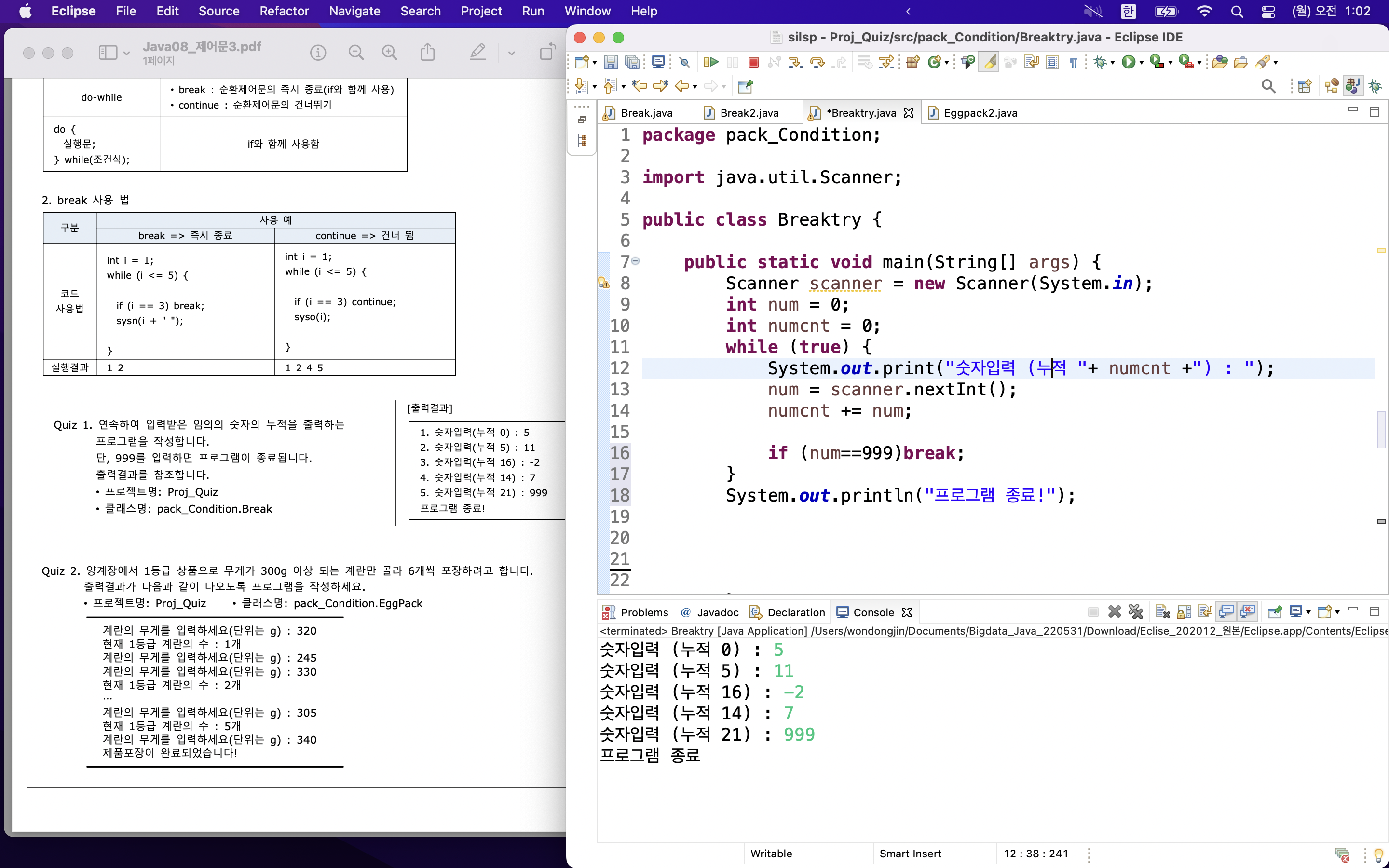 술술 풀리는 가 싶더니 계속 break;에서 막힌다. 분명히 나는 저 위에 break; 사용법 보고 따라했는데